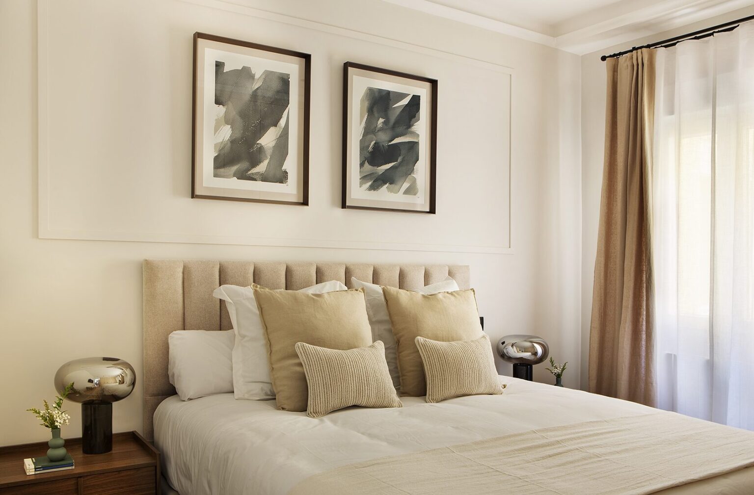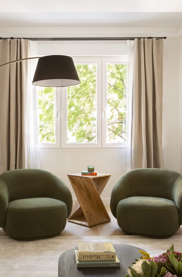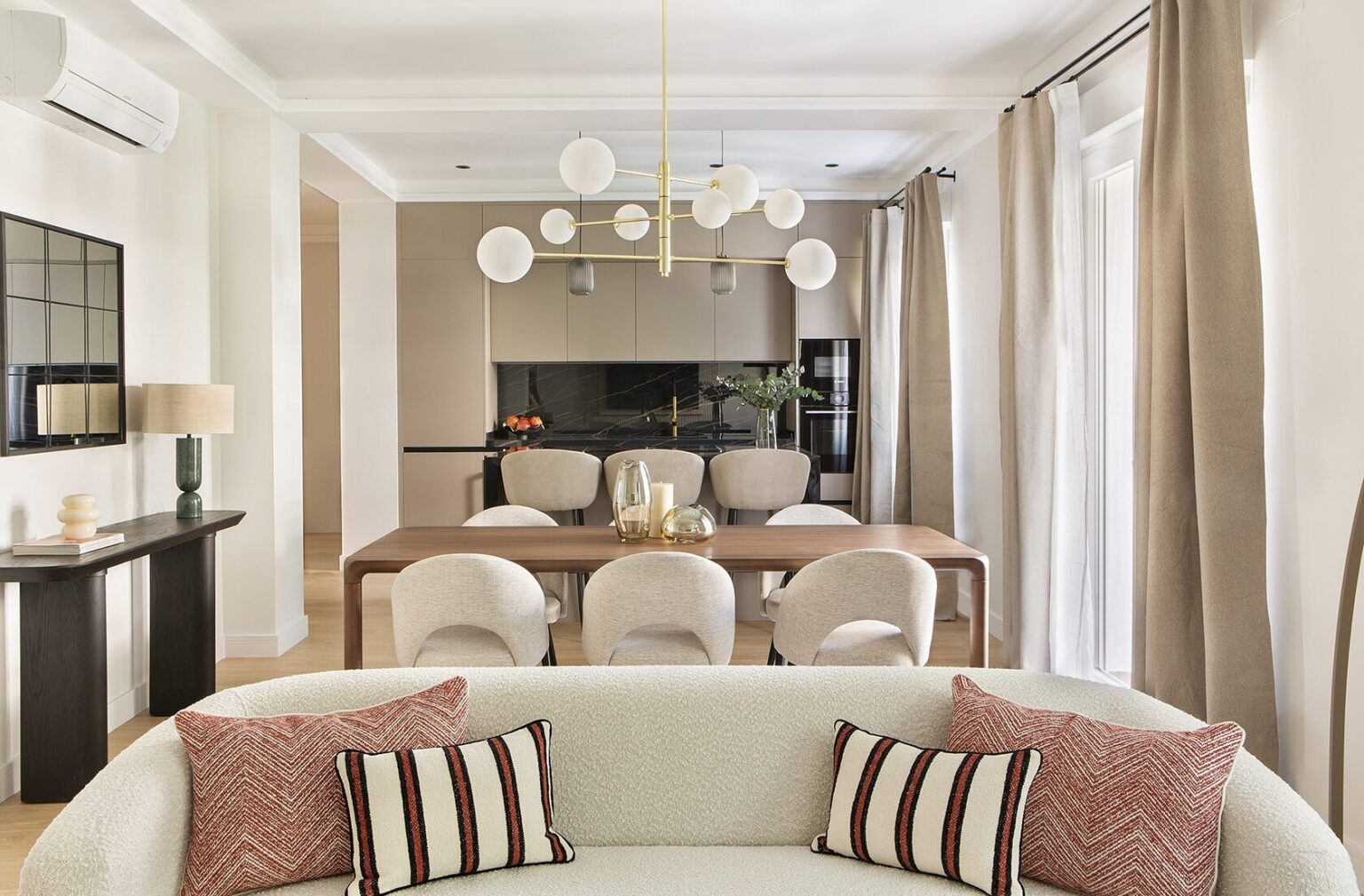 Nueva vida para este piso de los años 50 en una de las principales calles de Madrid donde se apostó por una redistribución completa del espacio. Se incorporó la cocina a la zona común de la vivienda y se plantearon 3 dormitorios con baño propio. La decoración, atemporal y en tonos neutros con ciertos acentos de color, invita a disfrutar sosegadamente de la calma que se respira en cada rincón de la casa.